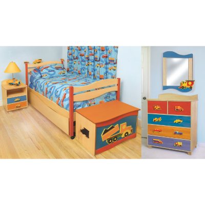 The Boys Like Trucks bedroom set comes complete with a twin bed with finials, twin comforter set, twin sheet set, 5-drawer chest, 2-drawer nightstand and dump truck lamp. Made with solid hardwood finished in natural and accented with colored stains, this quality designer bedroom set has unique features that make it as practical as it is attractive. All chest and nightstand drawer fronts are reversible - finished with colored stain on one side and natural finish on the other-allowing you to change the look of the chest as your child gets older, extending its use up to ... Read more
